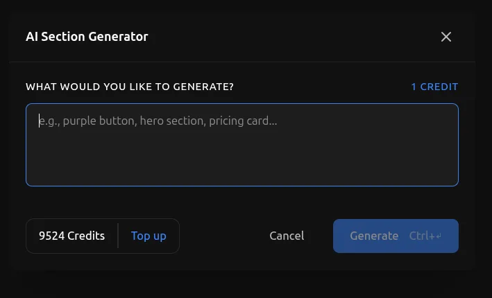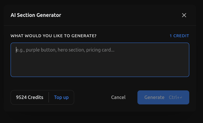 You can generate any element you want: buttons, full sections, cards, navigation menus, hero sections, contact forms, and more.