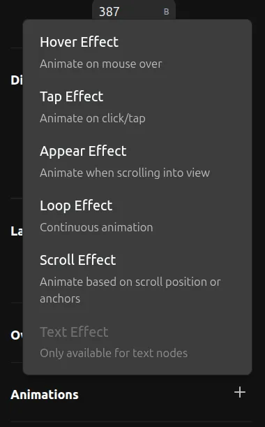 - Click the + button to add an animation