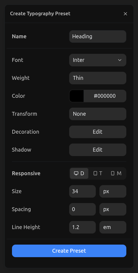 In the Responsive tab, you can set different sizes for Desktop, Tablet, and Mobile. When you apply the preset, the font size, spacing, and line height will be resolved respectively on every viewport.