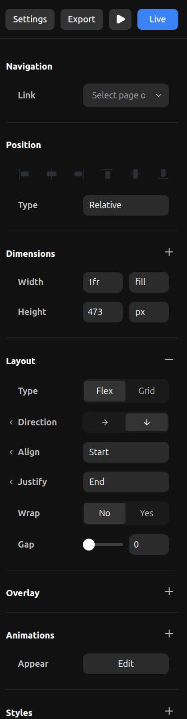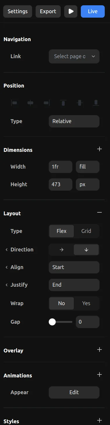 All styling and properties for your elements can be found in the right toolbar. Select any element to see and edit its properties.