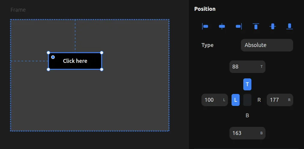 Elements can be positioned freely when set to position: absolute. You can drag them anywhere within their parent frame.