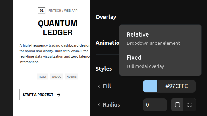 Note: Inside components, only relative overlays can be created, not fixed overlays.