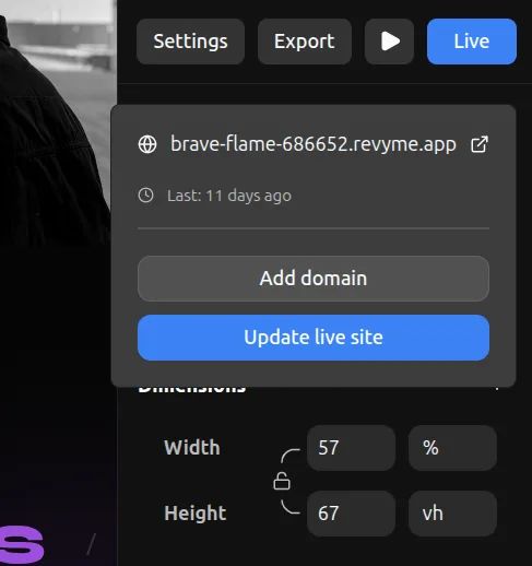 To publish your site live, click on the Live button in the top right menu. The first time will automatically publish your website. You can then see the placeholder domain created for your website.