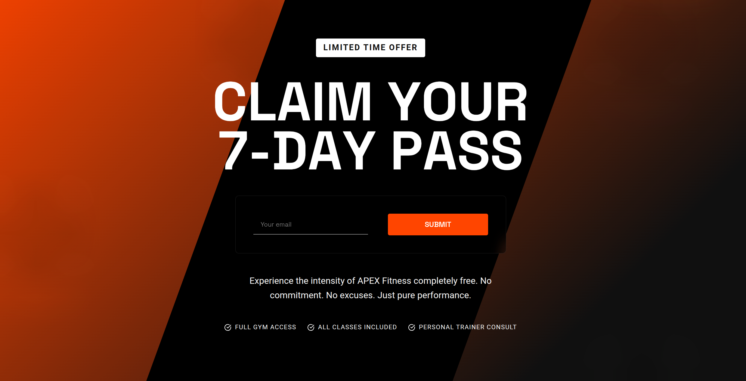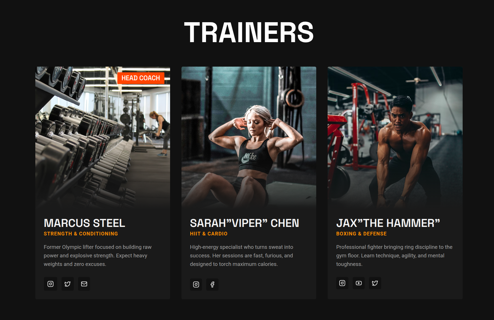 High-energy fitness studio with dark theme, motivational imagery, and bold gradient accents.