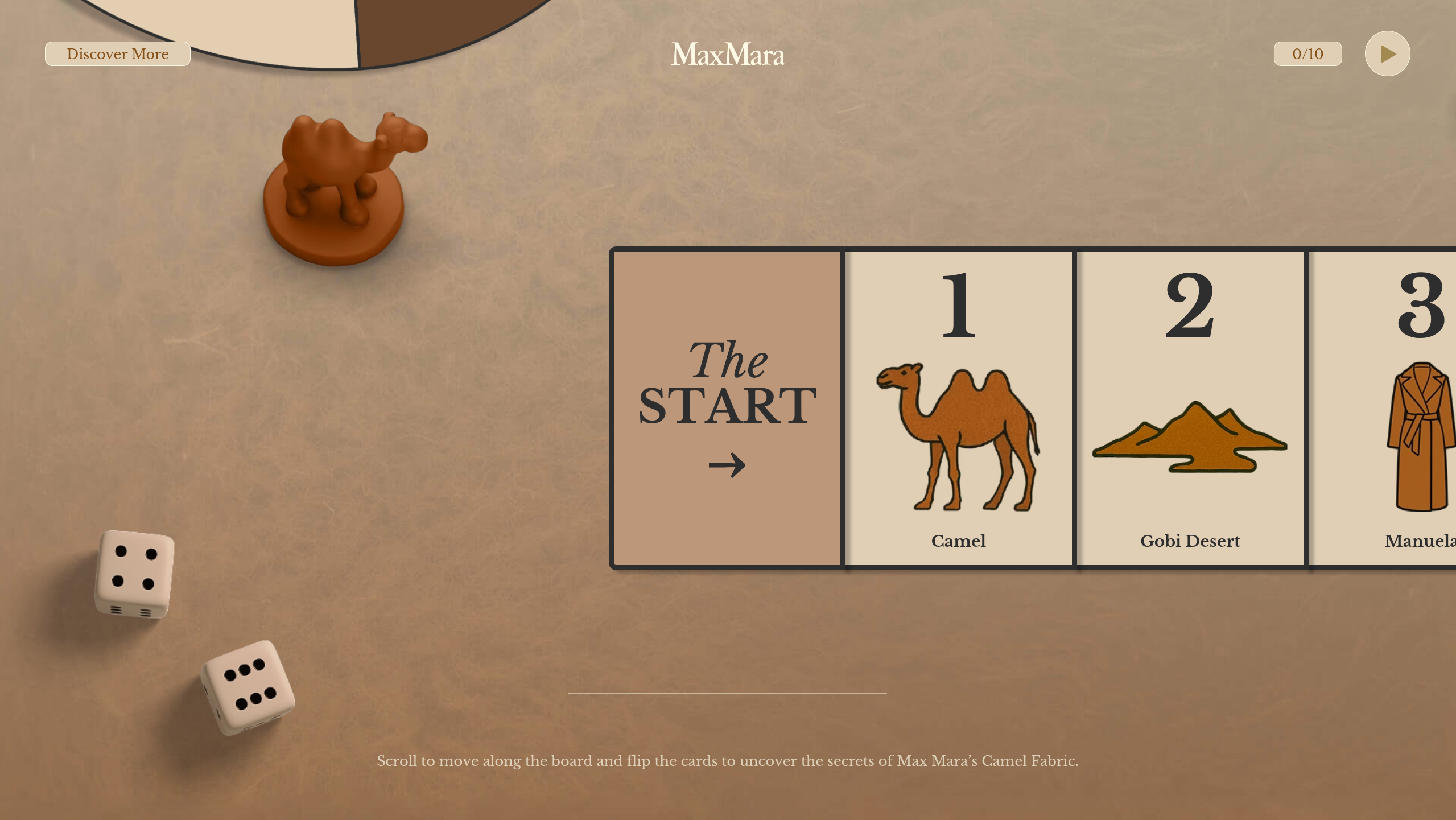 An interactive game where you help a camel navigate through a desert, built entirely with Three.js for Max Mara's iconic camel hair fabric.