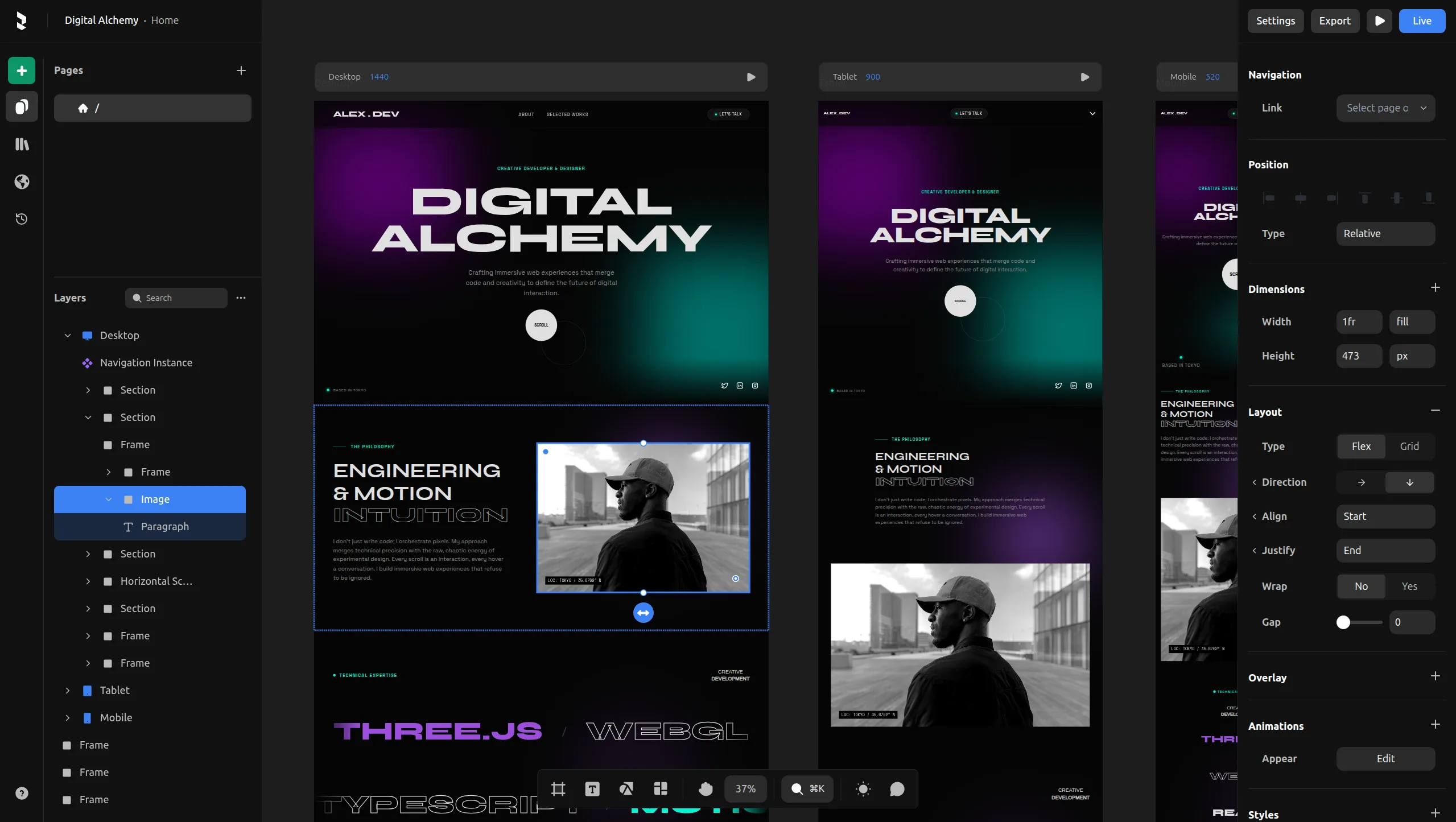 Build for desktop, tablet, and mobile in one place. Changes cascade automatically across breakpoints, with full control to customize each viewport.