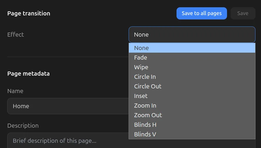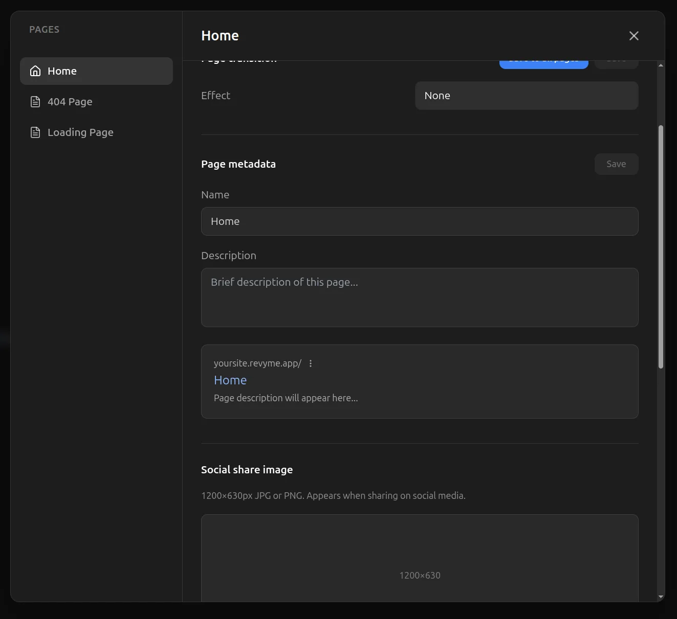 Here you can set transition settings and SEO settings for your page, including title, metadata, social share images, and more.