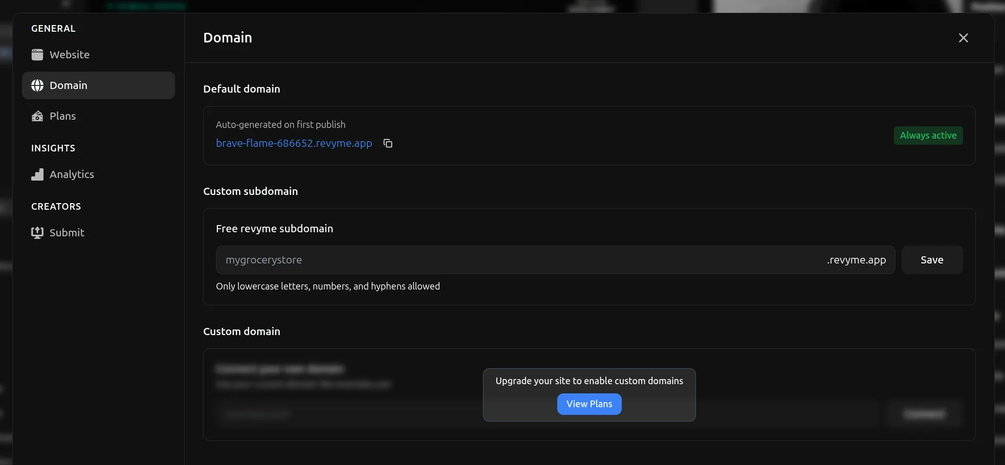 You can override this domain by setting your own free Revyme subdomain in the Settings of the website under the Domain tab.